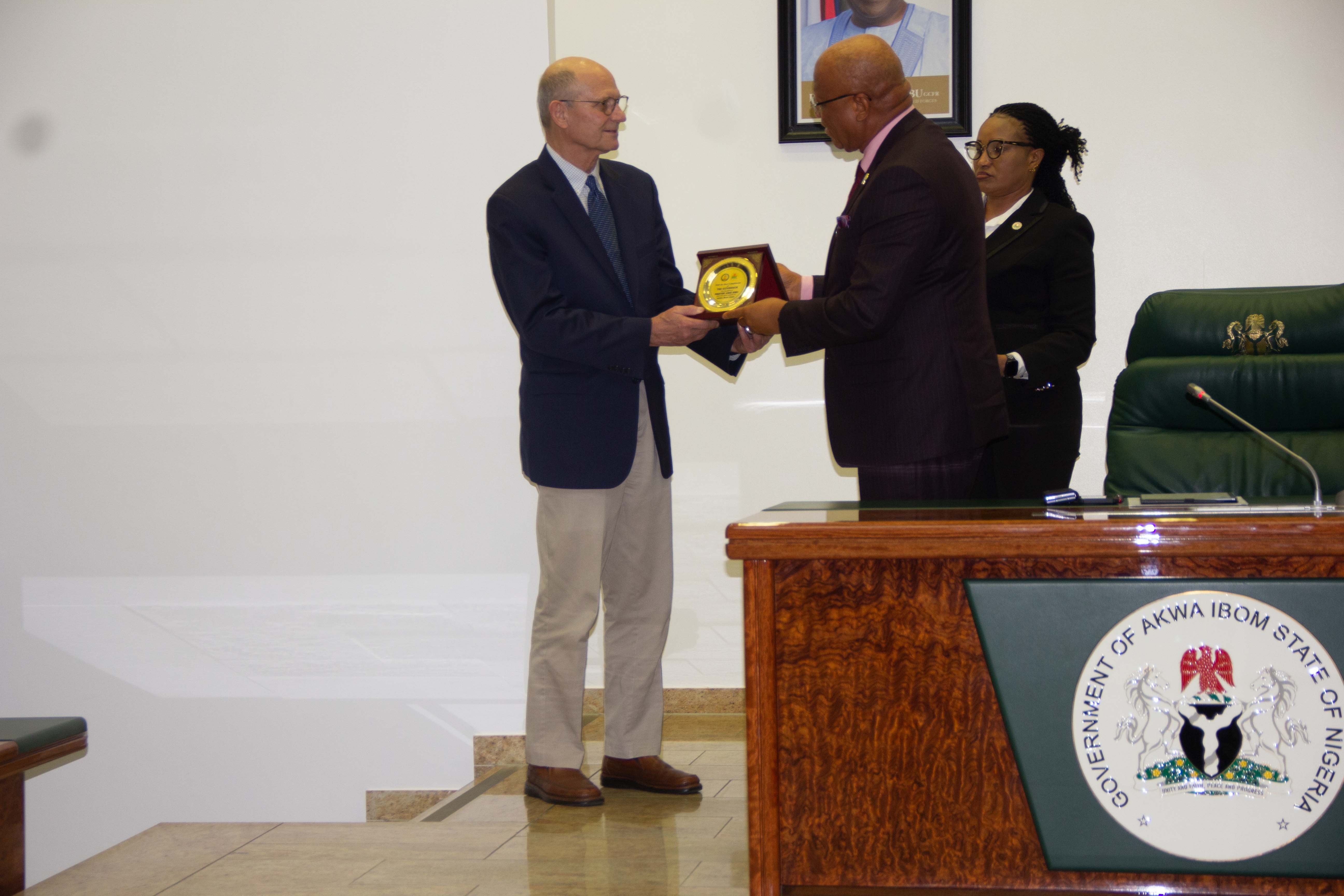 [Photo: Governor of Akwa Ibom State receives gift from Pastor Ted Wilson]