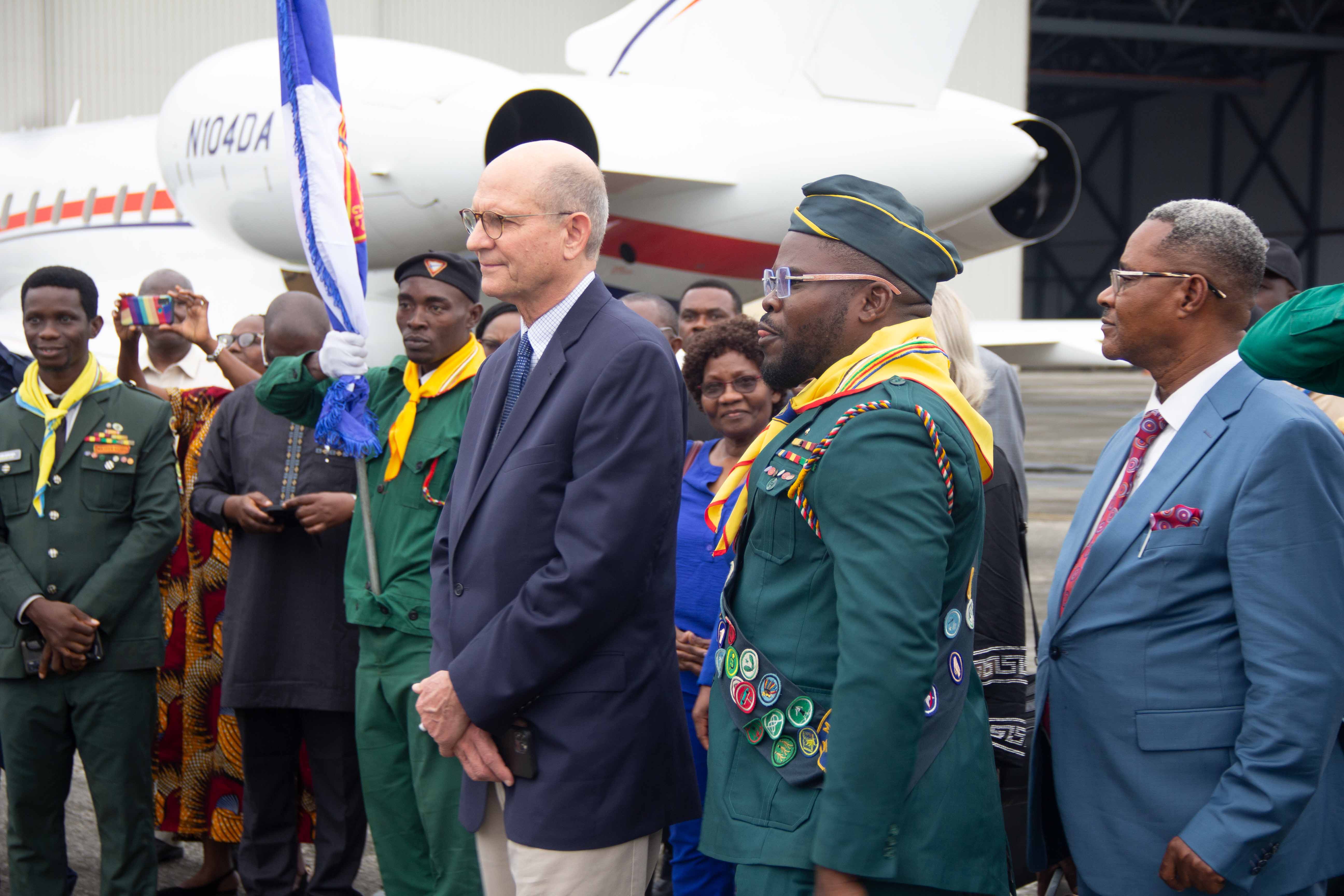 [Photo: President Ted Wilson thanks the crew as they get off the plane]